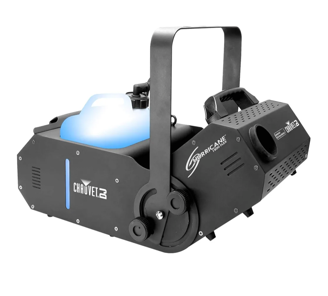 Hurricane 1800 Flex ofrece control DMX con ángulos ajustables de 180 grados. Un control remoto con temporizador con cable (FC-T) es una característica estándar; un control remoto inalámbrico (FC-W) también está disponible. Esta niebla a base de agua también viene con un indicador de bajo líquido y apagado automático, y funciona con el jugo de niebla a base de agua y el líquido de niebla platino para llenar un lugar en cuestión de minutos.